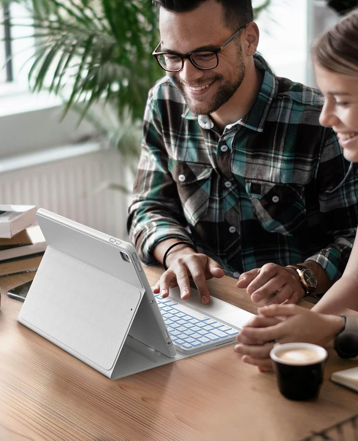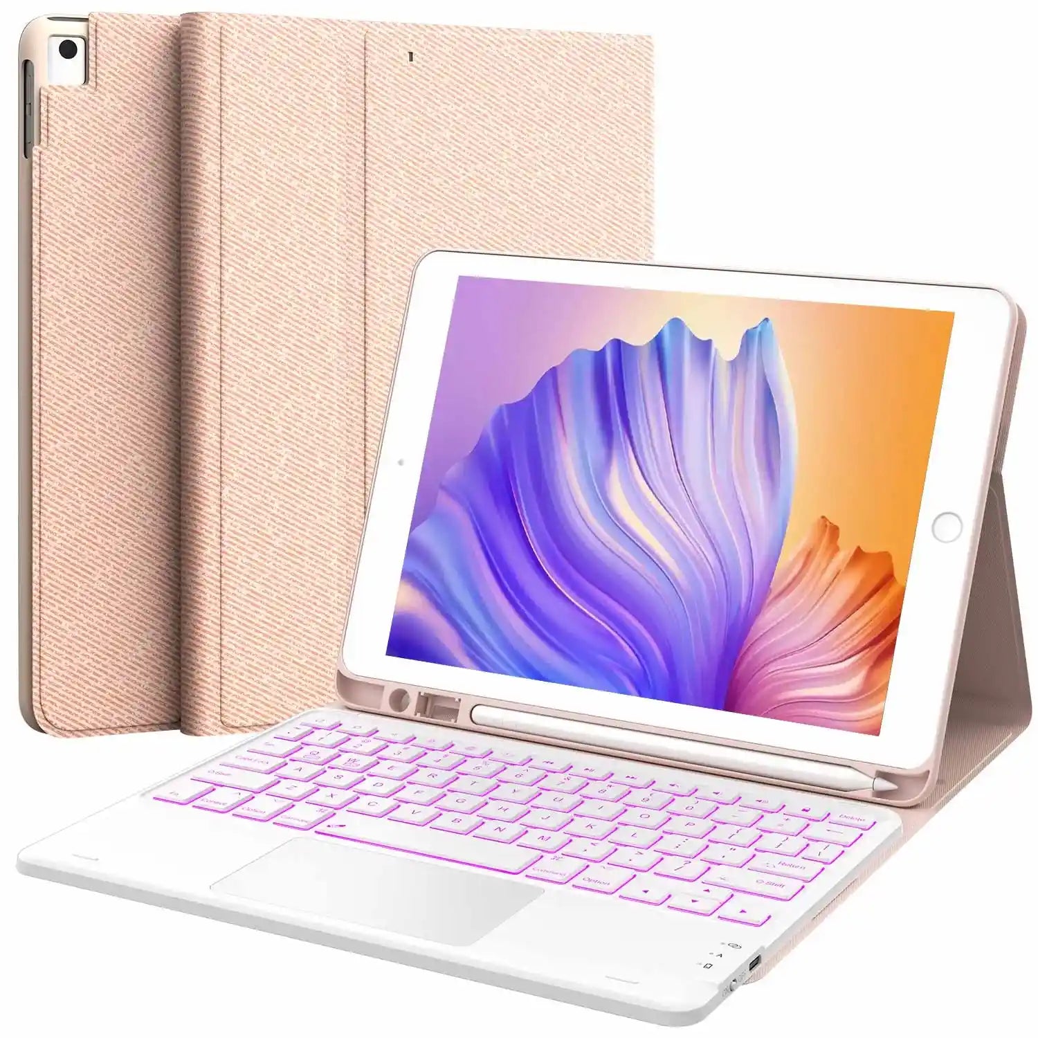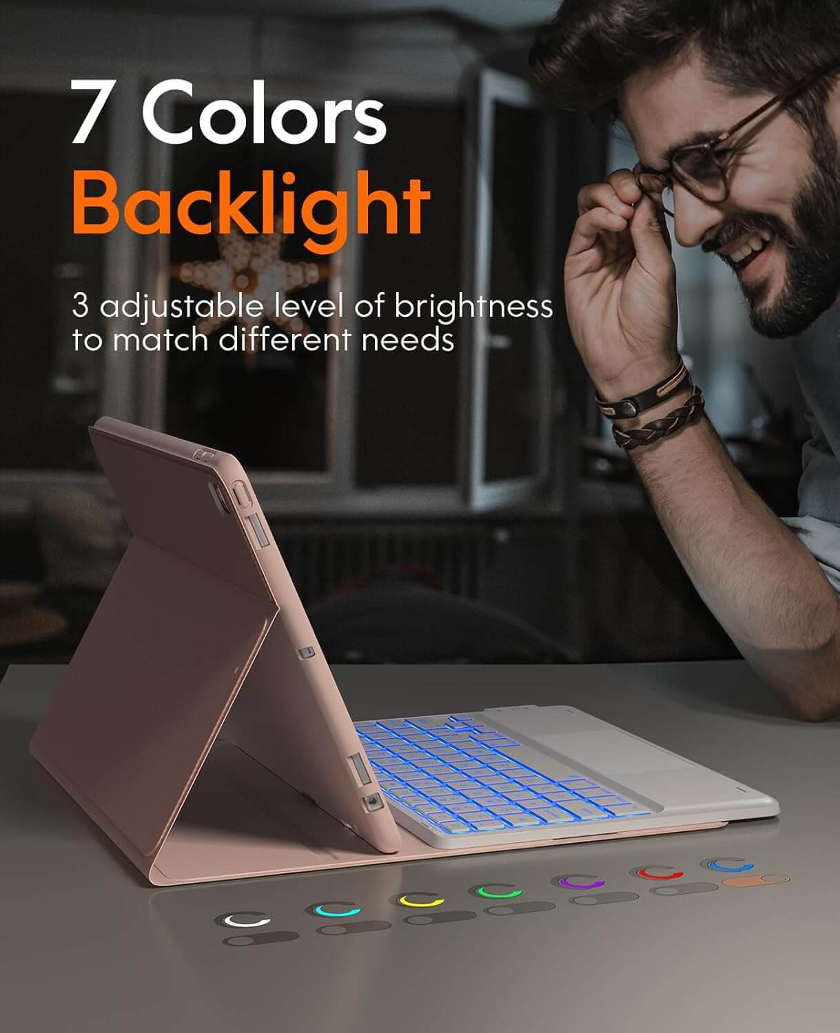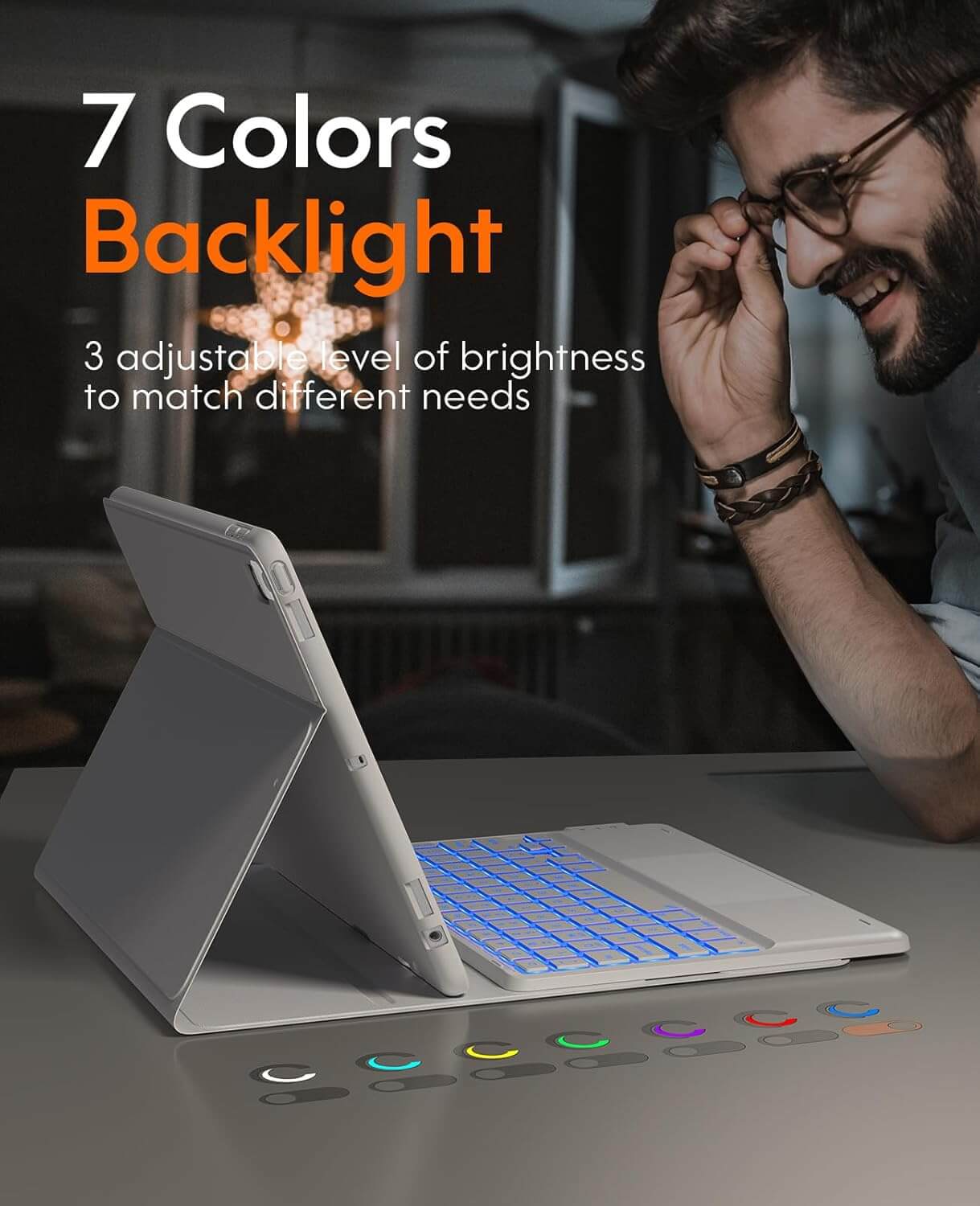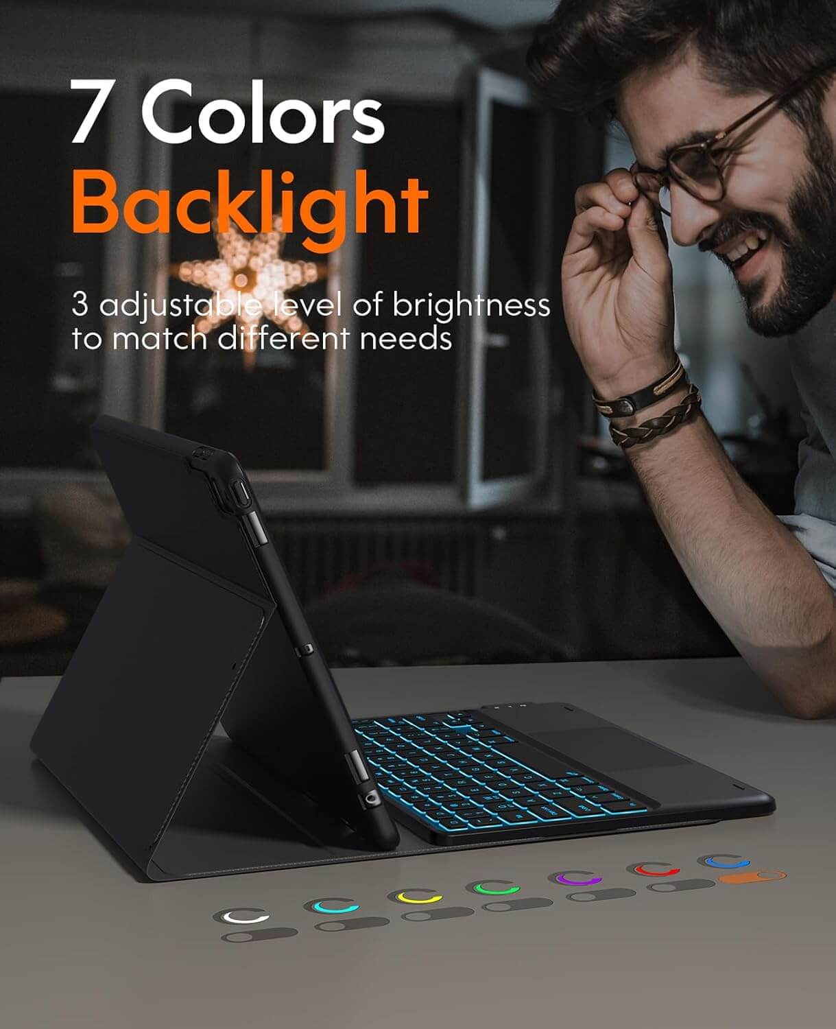 - 【BACKLIT KEYBOARD FOR IPAD 9TH GENERATION】- The keyboard case provides 7 color backlit options and 3 brightness modes, It has 3 brightness modes and breathing rate adjustments for more comfort. The spacious layout of the backlit keyboard is convenient for typing, and it is full of science and technology. You can read, browse and work freely anytime, anywhere.