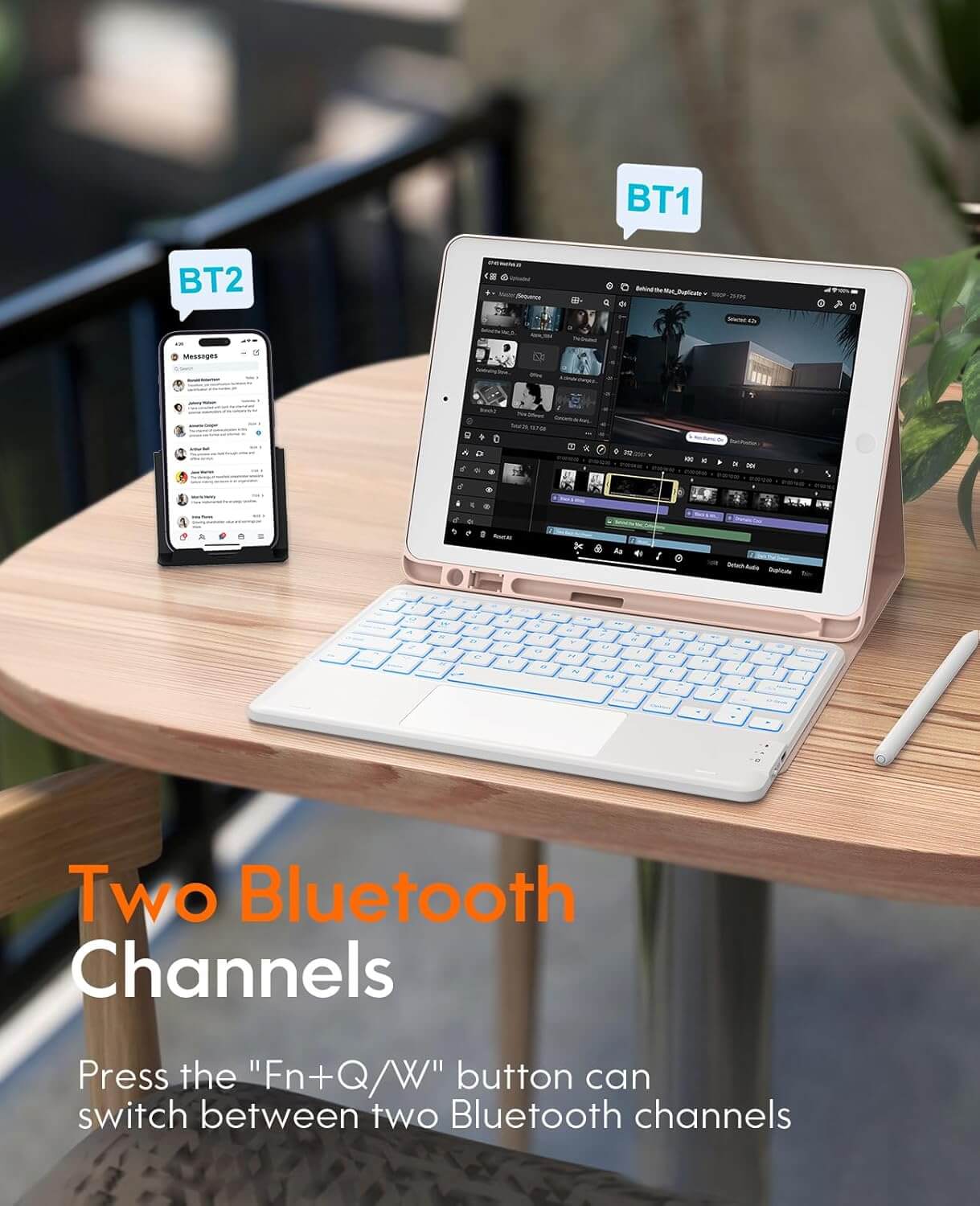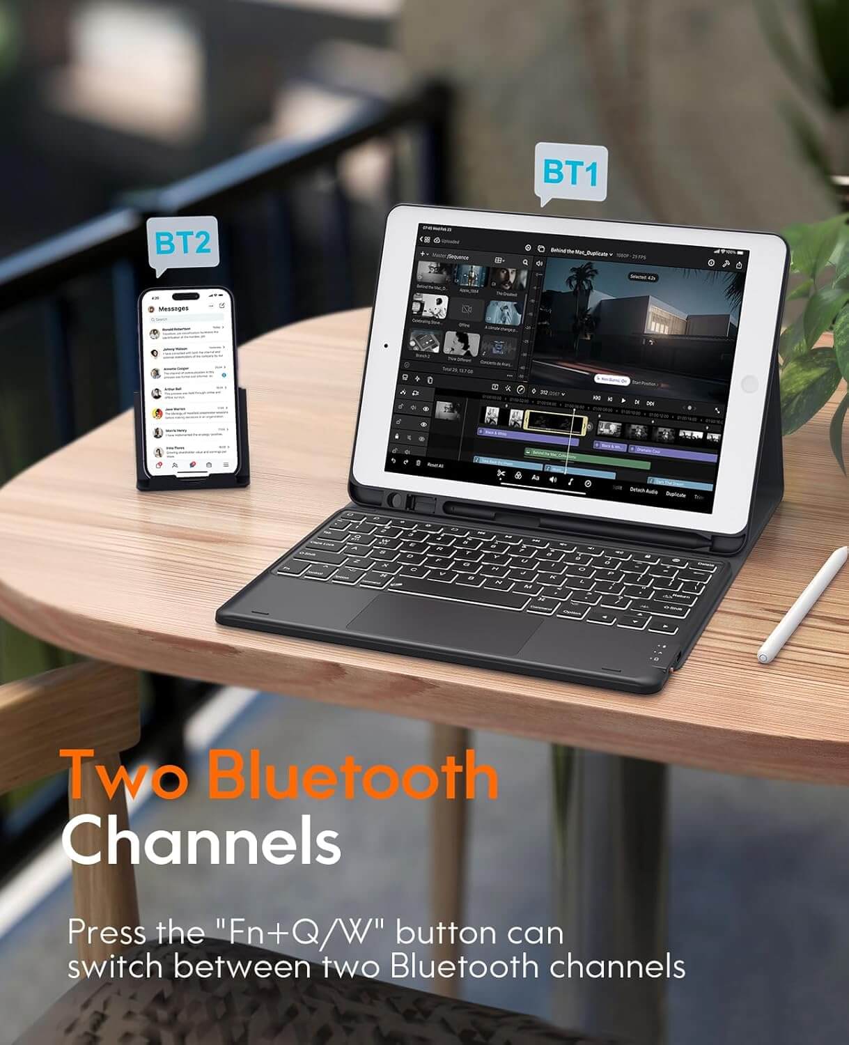 - 【2 Bluetooth Channels & PENCIL HOLDER】- Pair with up to 2 devices simultaneously and easily switch between them with only 1 click. Built-in Apple Pencil holder, cap & adapter slots, grab your Apple Pencil, easy to carry and use. Precise cutouts allow full access to all ports, sensors, speakers, microphones, and cameras.