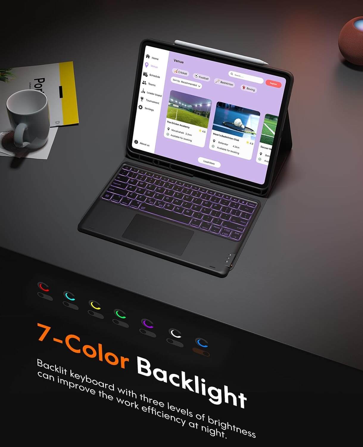 - 【7 Color Backlight Keyboard】With 7 color of backlighting options and 3 adjustable brightness modes, you can set your favourite colour to enhance the stylish look of your tablet. The versatile backlit keyboard provides a comfortable typing experience that's pleasing to the eye and is optimised for operation in low light. Read, type and work anywhere, day or night.