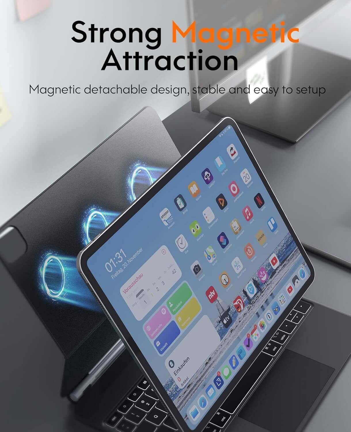 • POWERFUL MAGNETIC ATTRACTION -- Built-in strong magnet, it can instantly attach and hold your tablet from falling. Floating Cantilever stand supports smoothly installing or removing tablet, which is convenient to use in vacation, learning or business.
