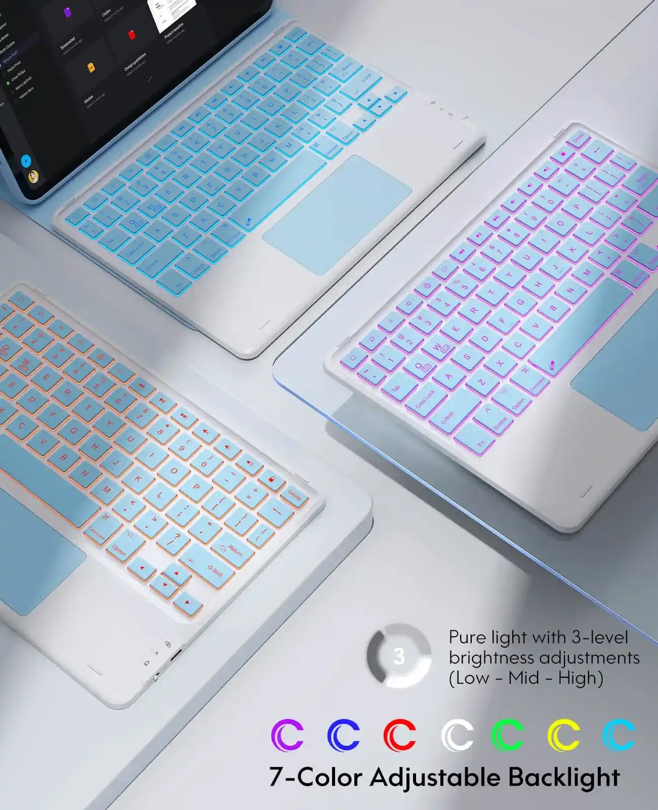 - [7-Color Backlit] 3 levels and 7 Color Backlight with this keyboard case. That can typically be customized and adjusted to different brightness levels to provide an aesthetically pleasing for users. The lighting can also enhance the visibility of keys in low-light environments, making it easier to type and work on the keyboard.