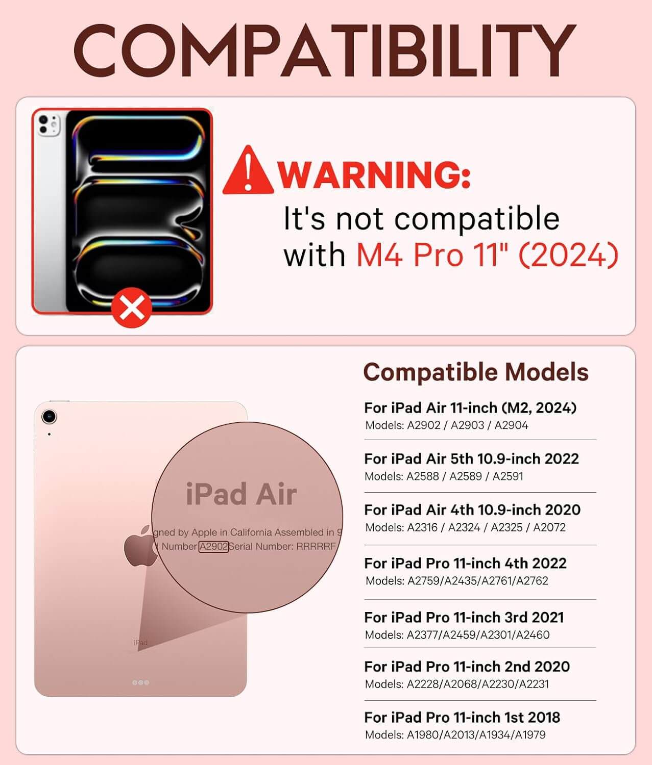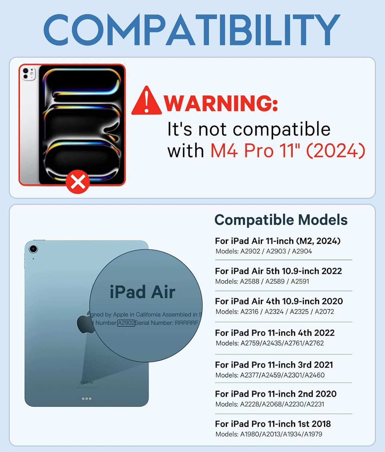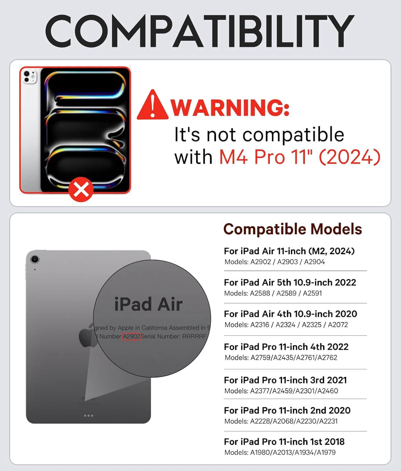 [Compatibility] Compatible with iPad Air 11-inch (M2)2024, Air 5th Generation 10.9 inch 2022 (A2588/A2589/A2591) / Air 4th Generation 10.9 inch 2020 ( A2072/A2316/A2324/A2325 ), Pro 11 inch 4th Generation 2022(A2759/A2435/A2761/A2762) / Pro 11 inch 3rd Generation 2021 (A2377/A2459/A2301/A2460) / Pro 11 inch 2nd Generation 2020 (A2228/A2068/A2230/A2231) / Pro 11 inch 1st Generation 2018 (A1980/A2013/A1934). Please check the model of iPad before purchasing.
