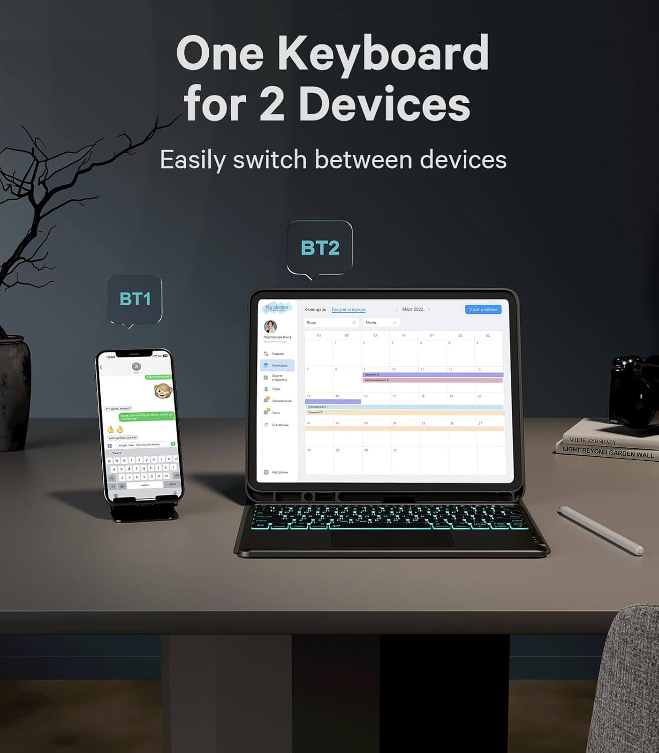 - [2 Device Connection]: Supports connecting to 2 devices. Easily switch between your iPad Pro 13 and your phone with the smart connection feature, allowing you to work seamlessly without needing constant re-pairing—all with just a tap (FN+C/V).