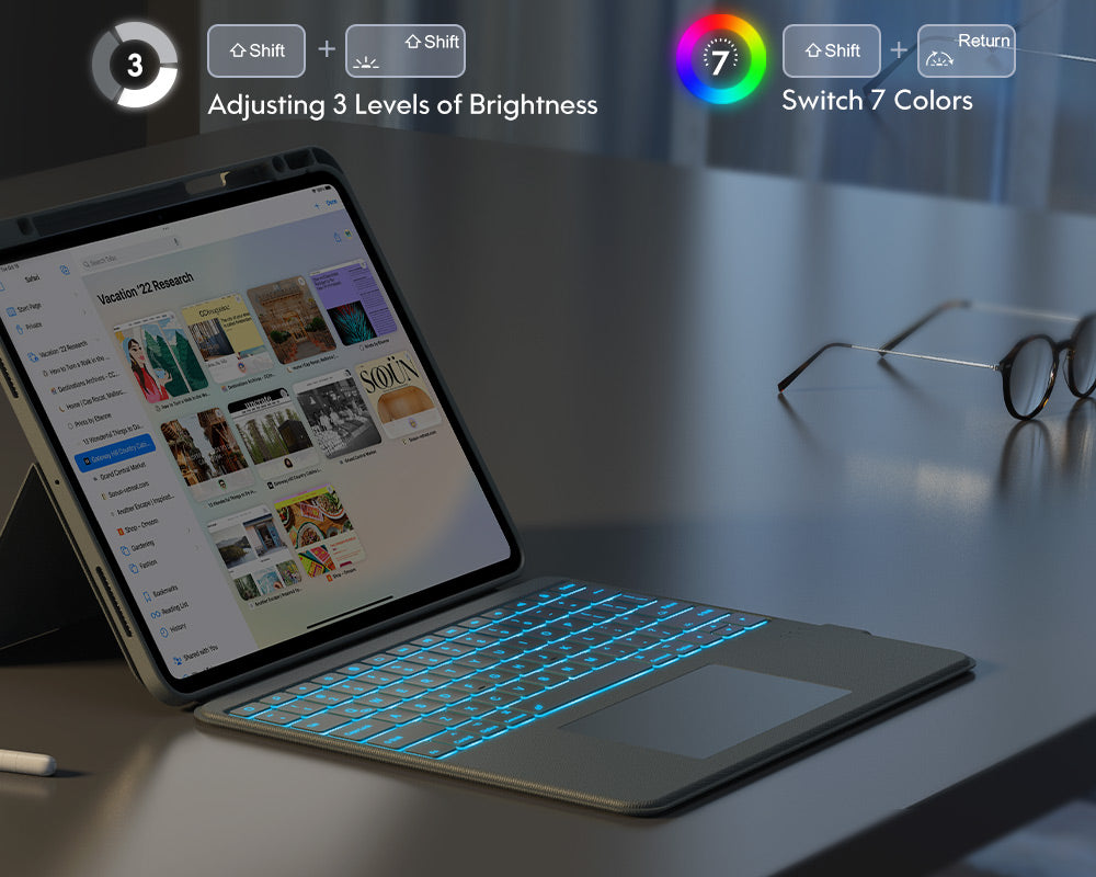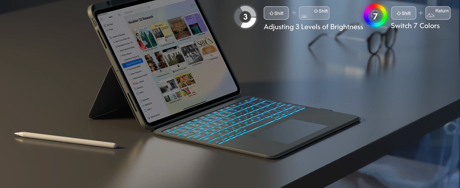 【7-Colors Backlit & Shortcuts】: With 7 backlight colors and 3 levels of brightness, it's easy to use your tablet even in dark environments. With a complete set of multimedia shortcuts.