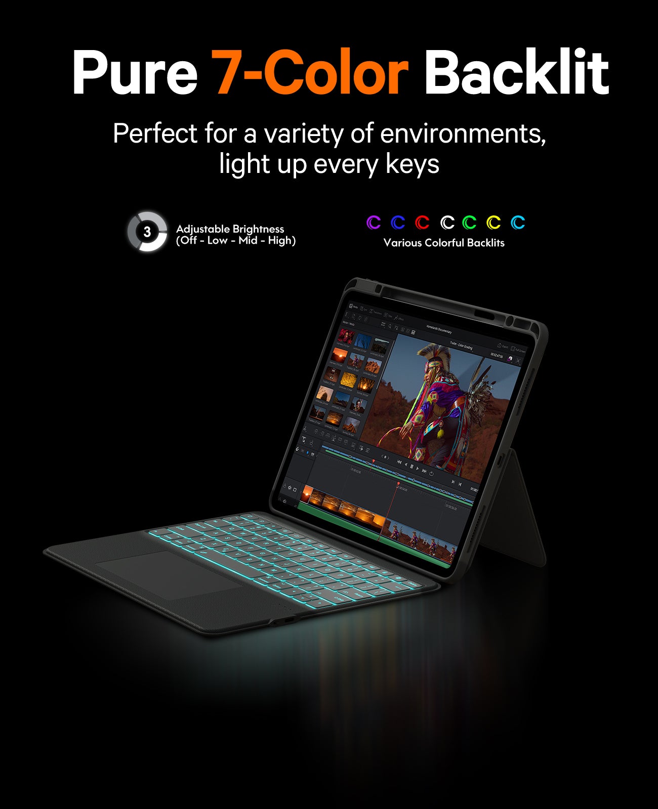 【7-Colors Backlit & Shortcuts】: With 7 backlight colors and 3 levels of brightness, it's easy to use your tablet even in dark environments. With a complete set of multimedia shortcuts.