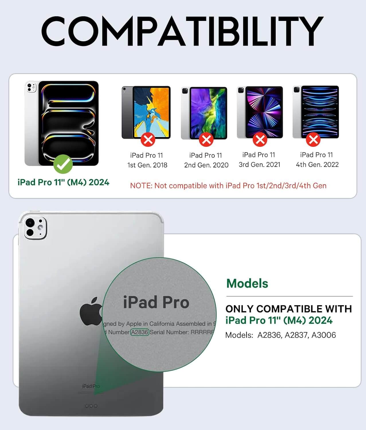 Compatibility: For iPad Pro 11-inch (M5)(2025), Please check your iPad model number on the back to ensure a perfect fit before purchasing. NOTE: IT'S NOT FIT FOR iPad Pro 11 (4th/3rd/2nd/1st Gen), iPad Air 11(M2) 2024.