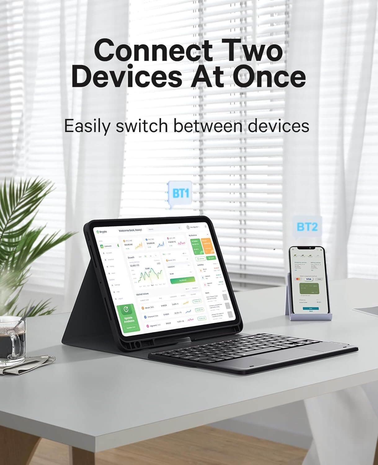 - Dual Bluetooth Connectivity: Switch seamlessly between your iPad Pro 11 m4 and your smartphone with a simple keystroke. Equipped with dual Bluetooth channels, this keyboard case for 11 inch iPad keeps you productive without missing a beat.
