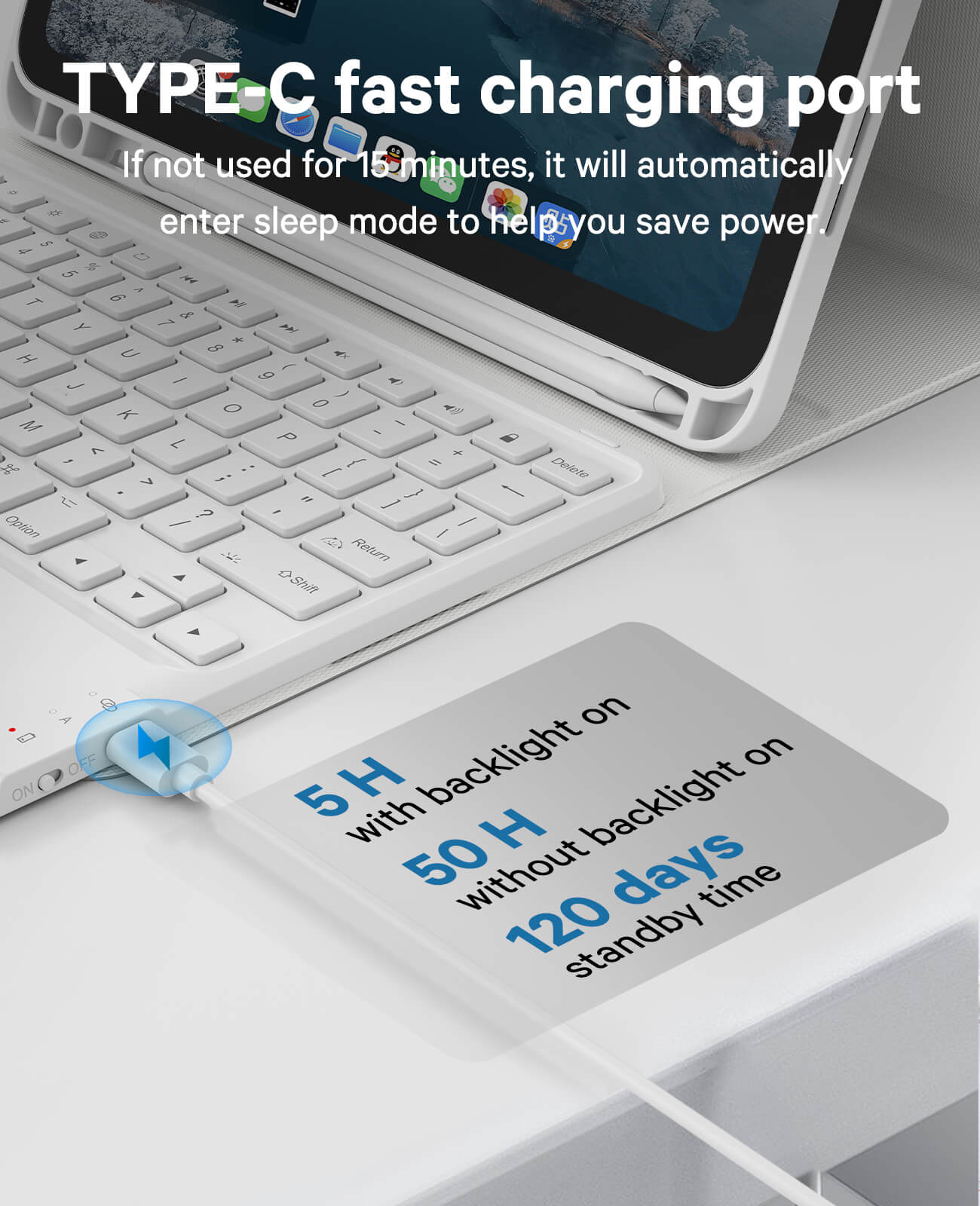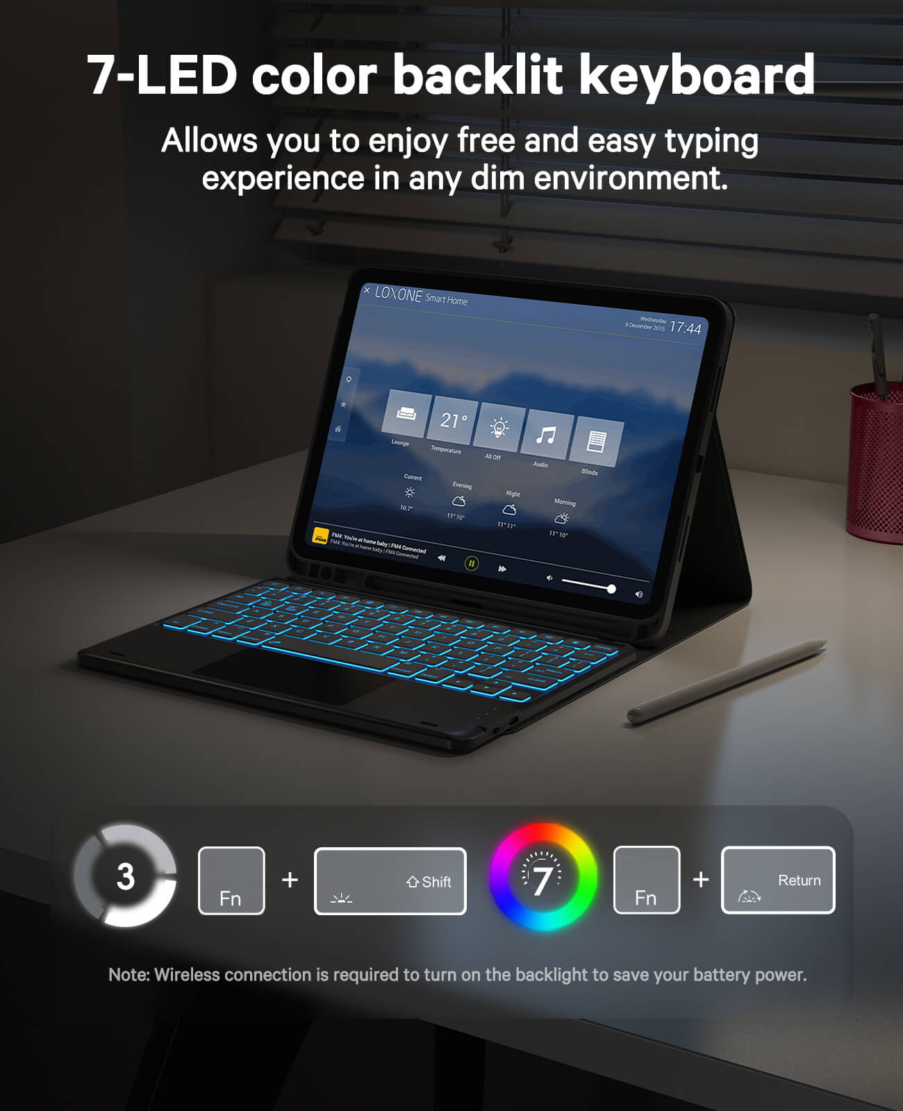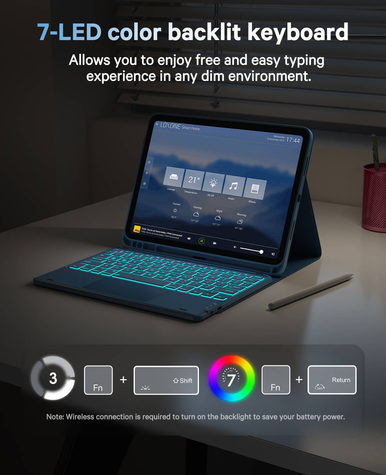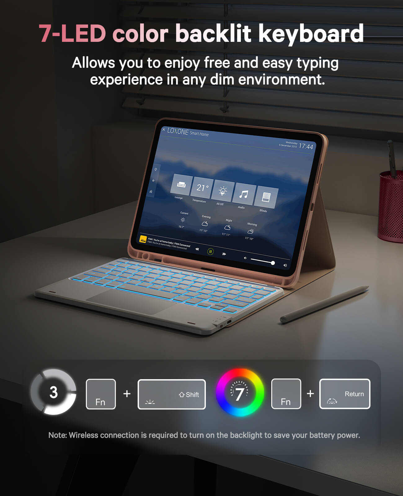 【Backlit Keyboard for iPad 10th Generation】: Three-level adjustable brightness and 7 pure led backlit, engaging yourself in a free and relaxed typing experience in any dim condition.