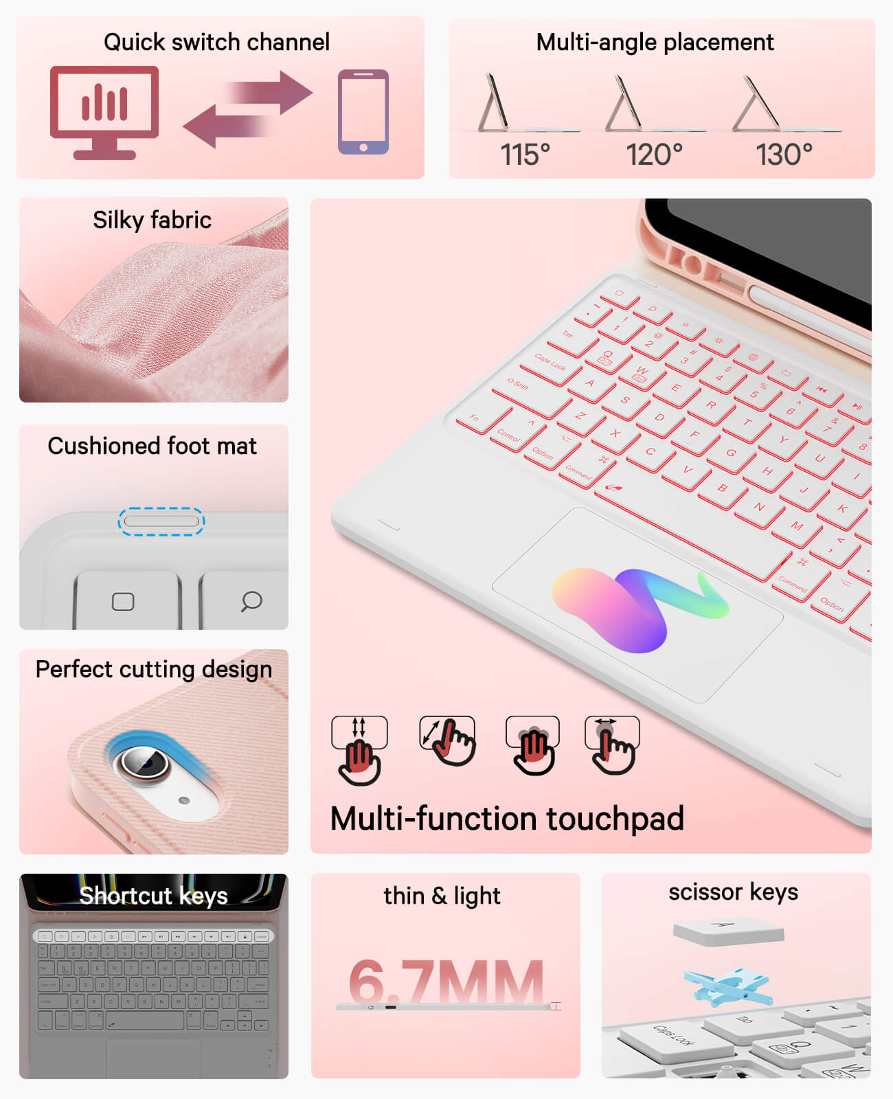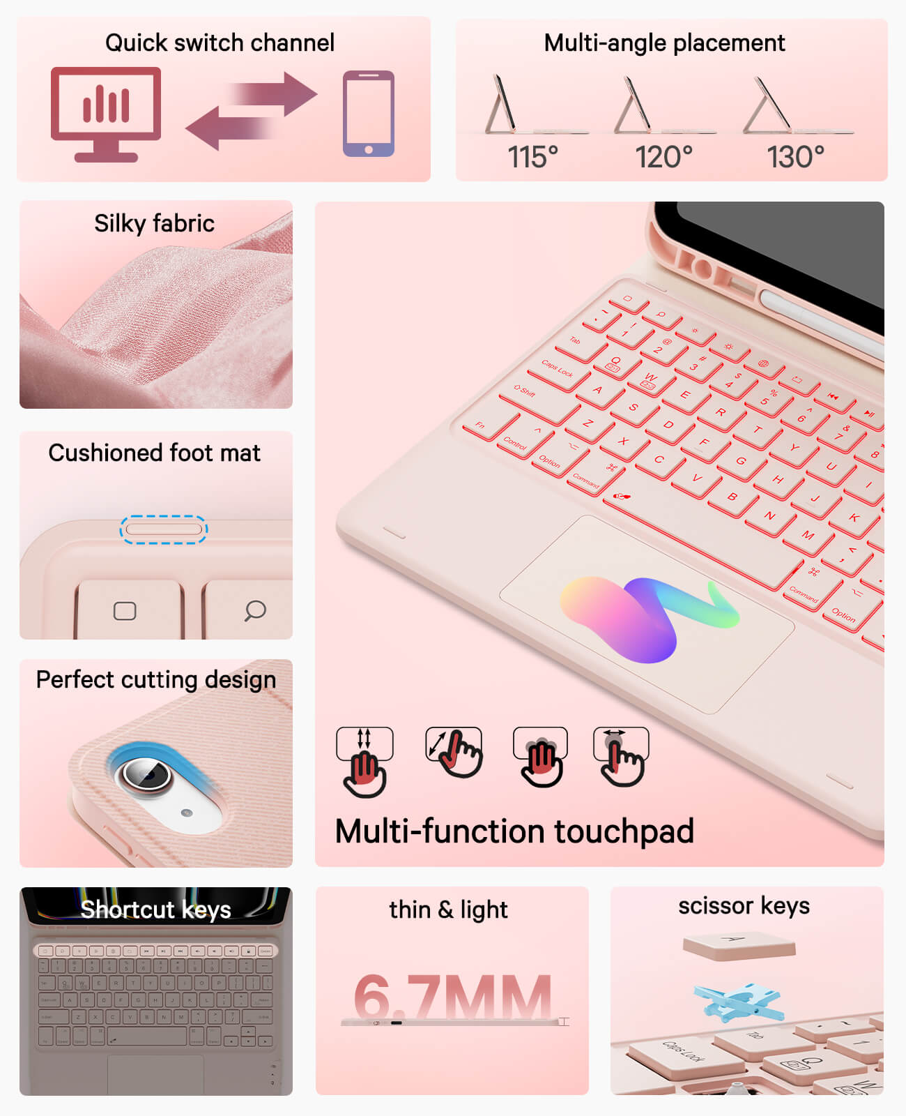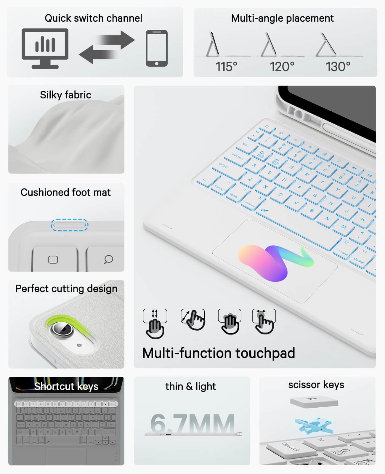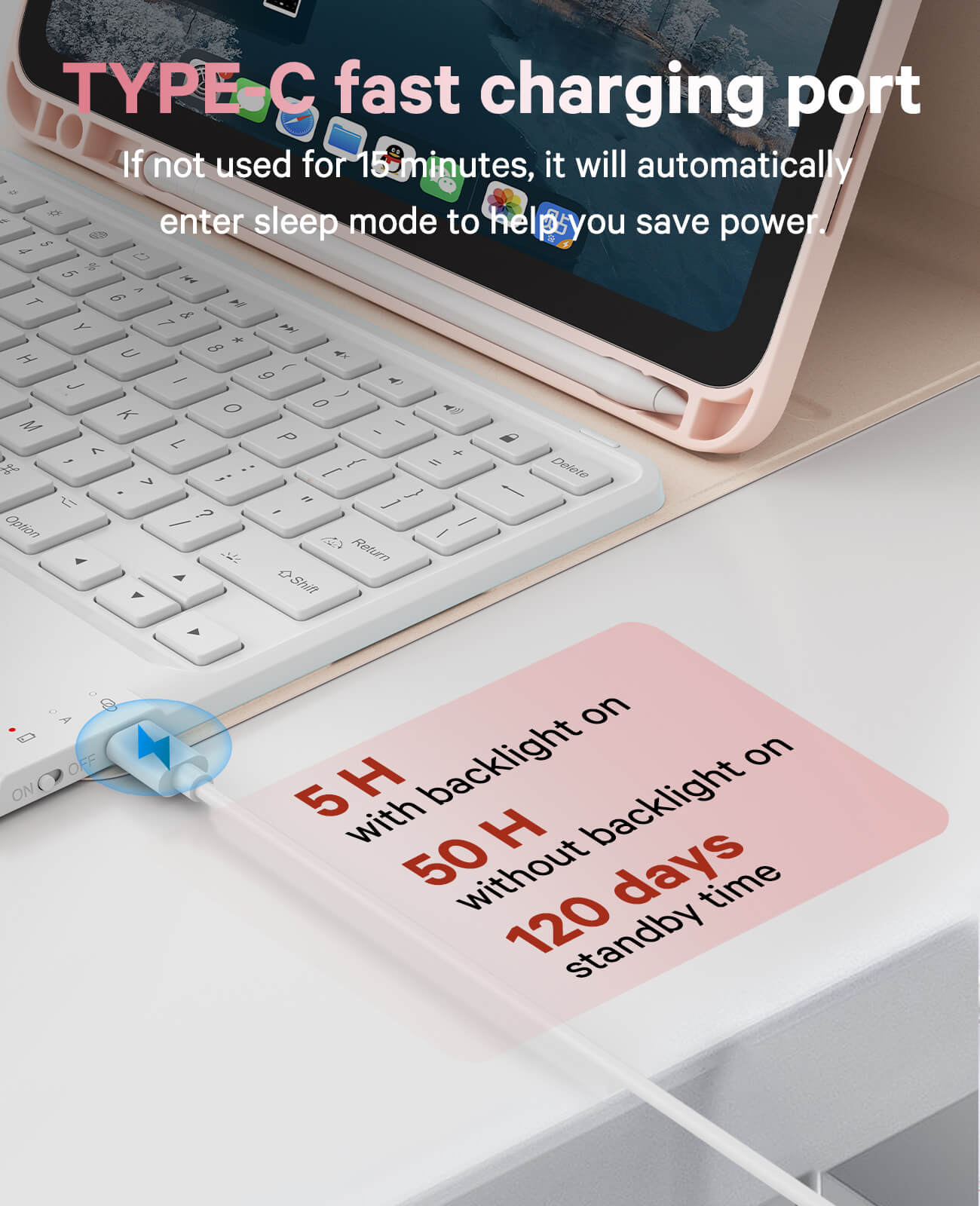 【Backlit Keyboard for iPad 10th Generation】: Three-level adjustable brightness and 7 pure led backlit, engaging yourself in a free and relaxed typing experience in any dim condition.