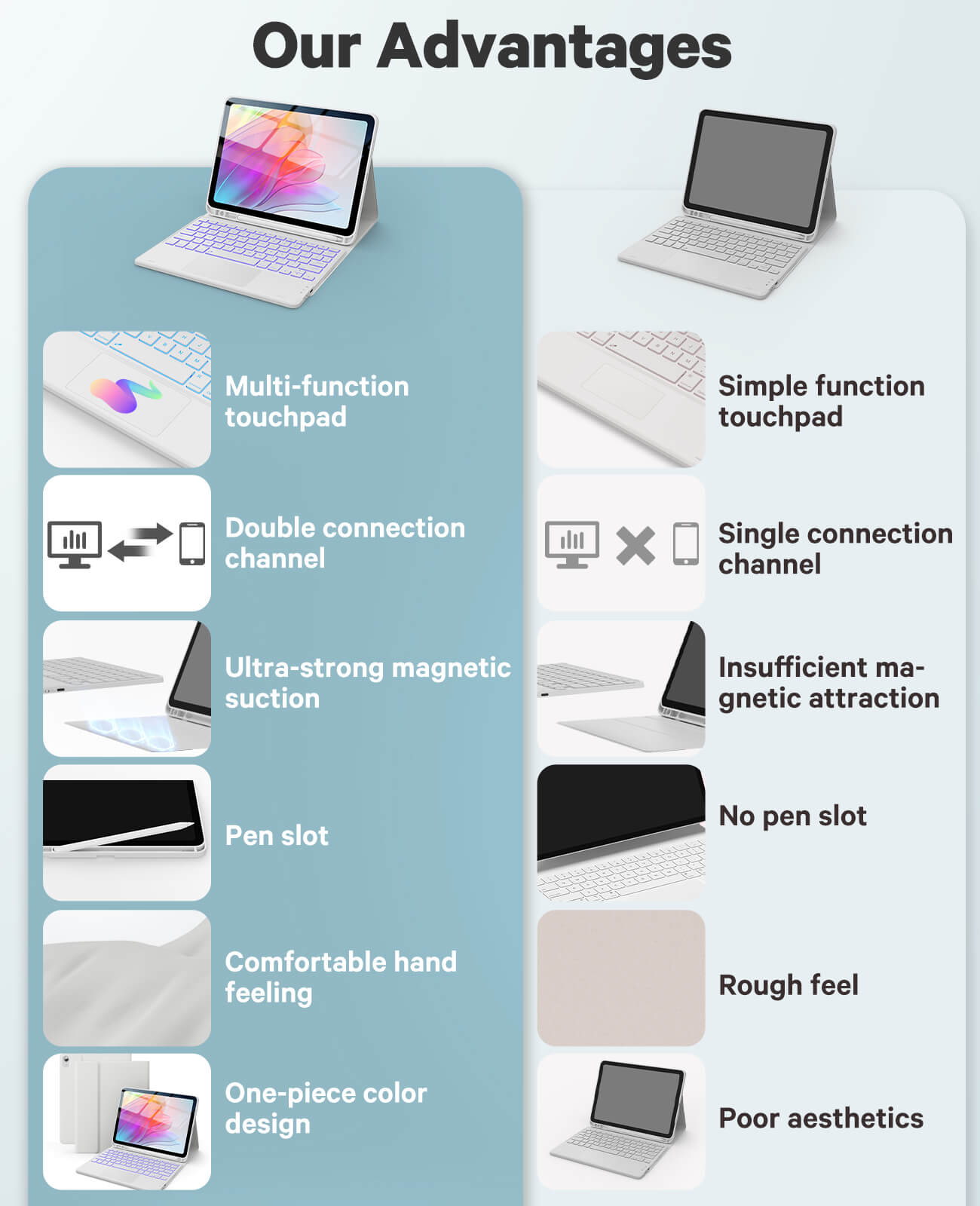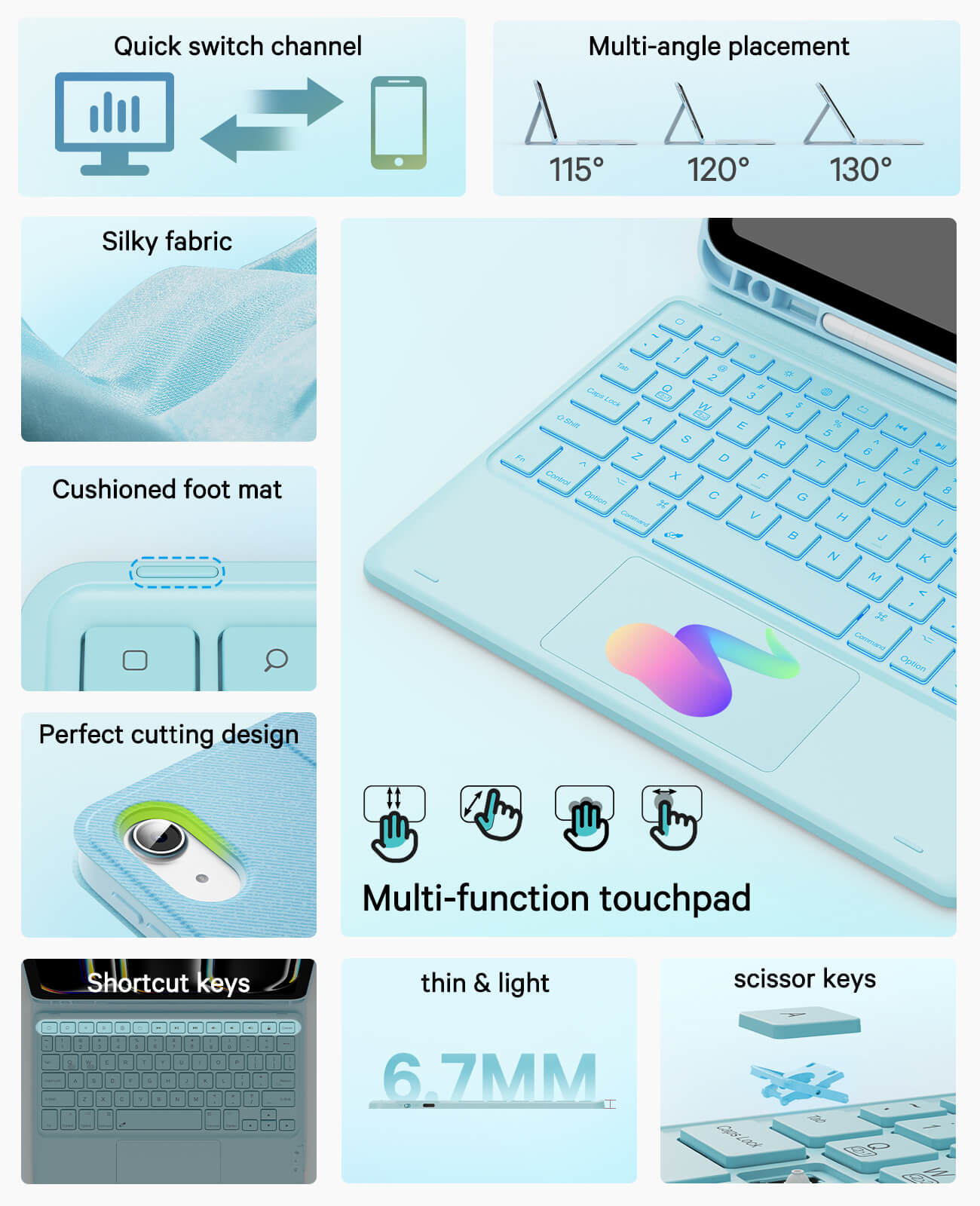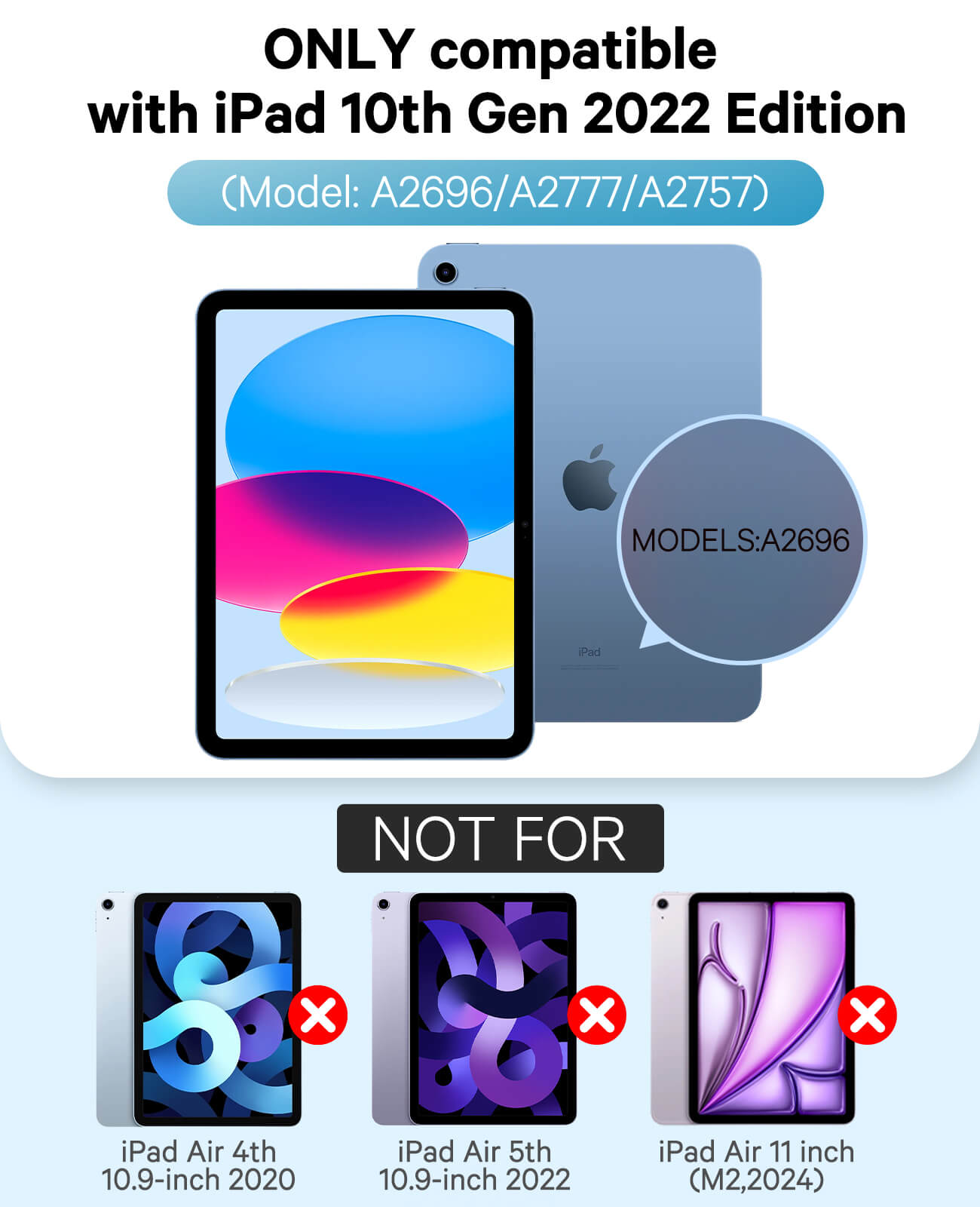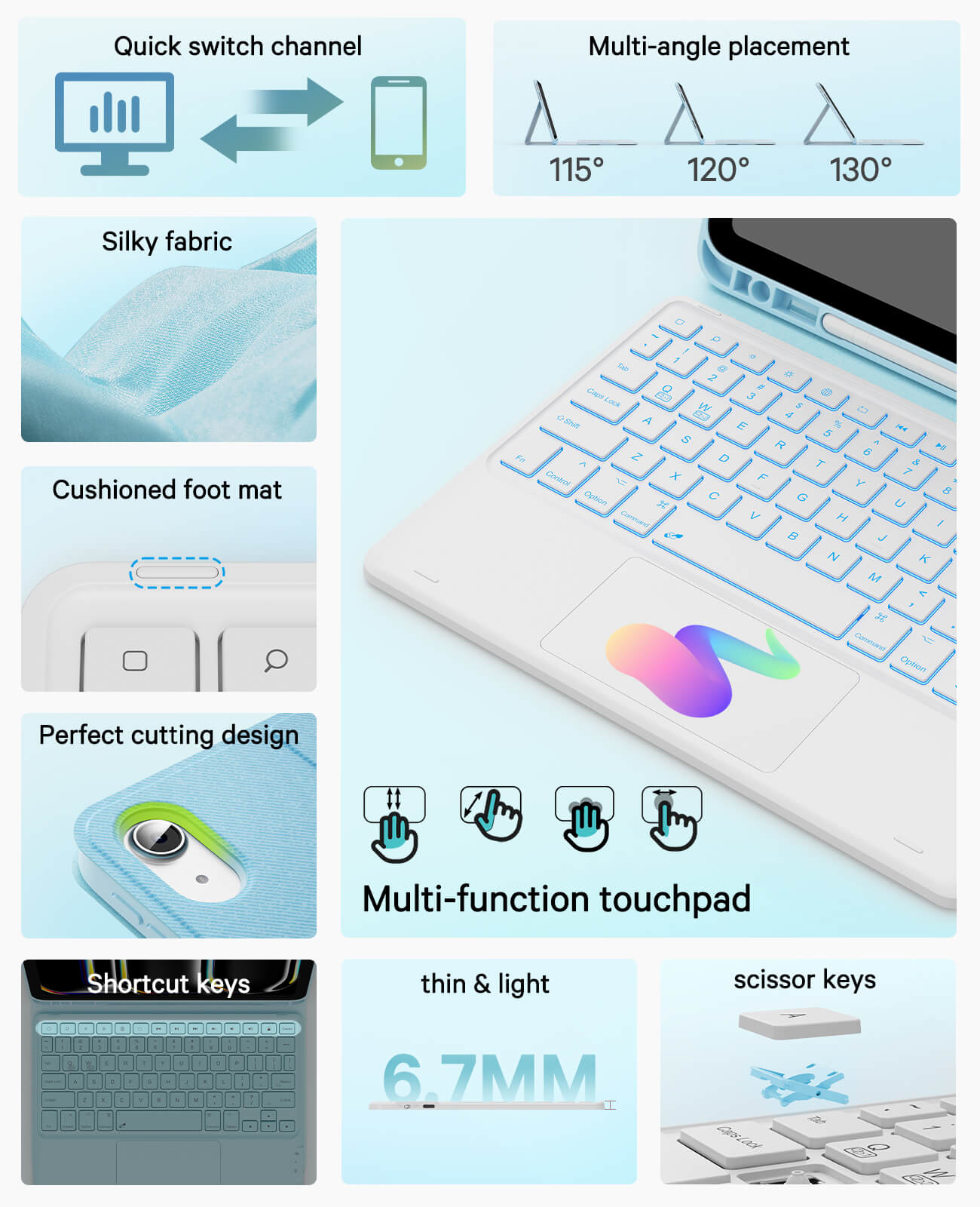 【Backlit Keyboard for iPad 10th Generation】: Three-level adjustable brightness and 7 pure led backlit, engaging yourself in a free and relaxed typing experience in any dim condition.