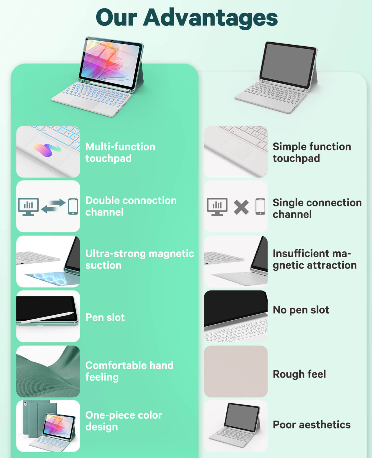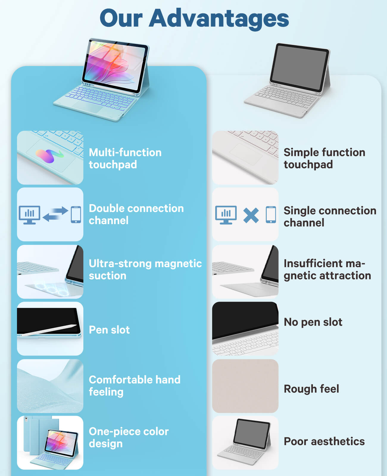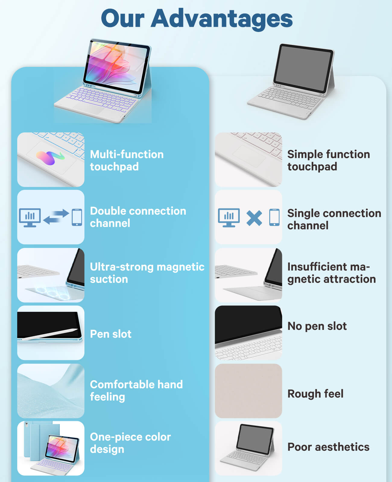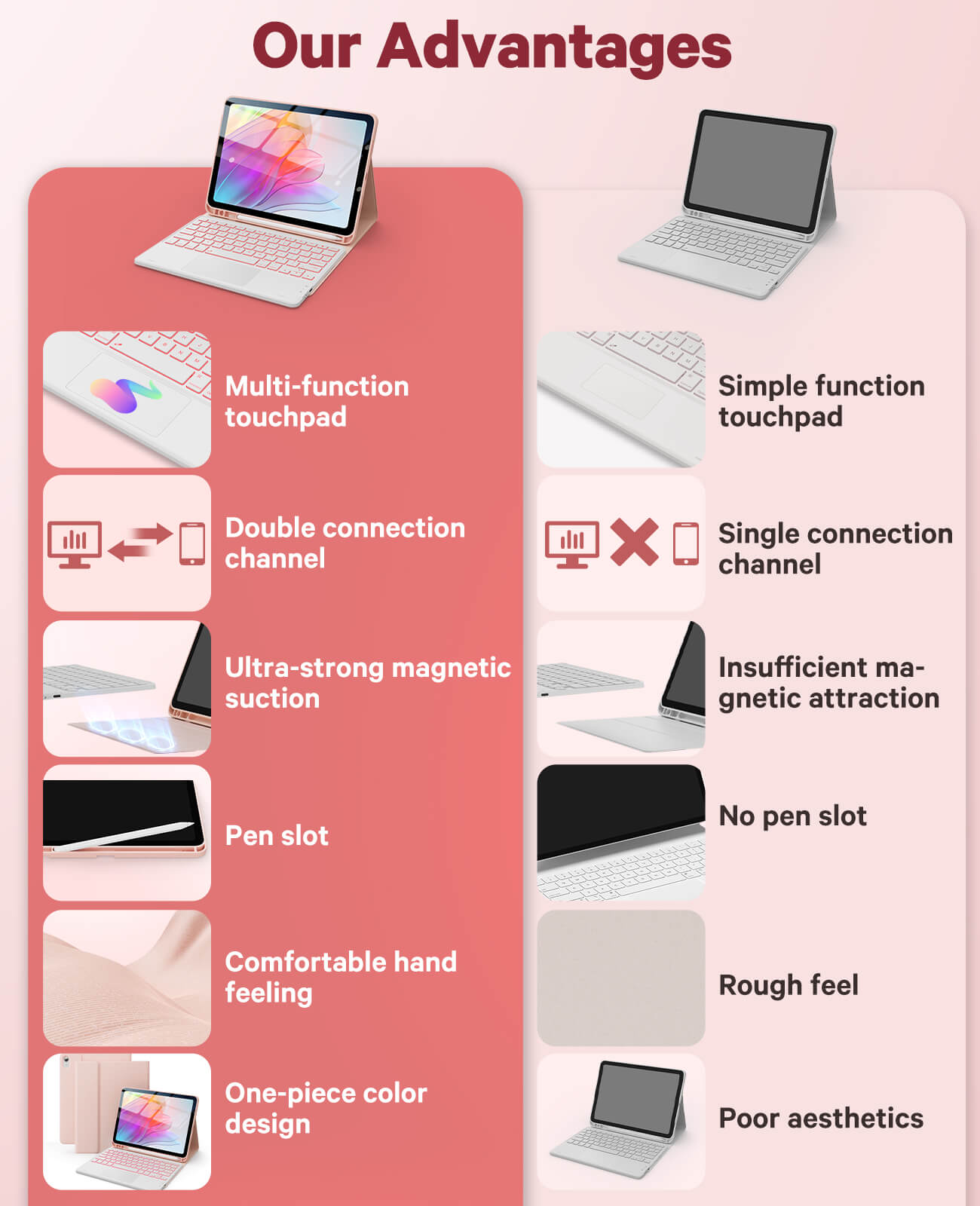 【Backlit Keyboard for iPad 10th Generation】: Three-level adjustable brightness and 7 pure led backlit, engaging yourself in a free and relaxed typing experience in any dim condition.